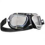The chrome plated solid brass frame is hand stitched to a soft leather face mask. The nose bridge screw is manufactured using a quality stainless steel. The lenses are made from a good quality polycarbonate that is treated with a scratch resistant coating to prevent damage to the surface. Each lens is housed in an independent frame that can be easily removed from the goggle to allow replacements to be fitted or to simple switch them with tinted lenses if the sun is shining.